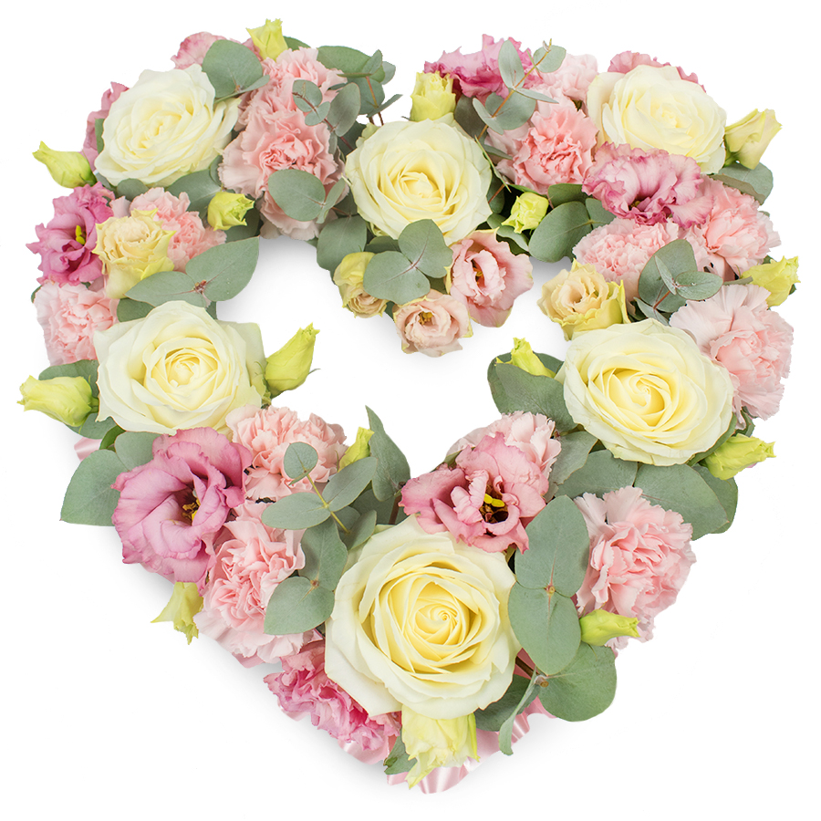 Show your respect and sympathy with our Respectful Open Heart Sympathy Bouquet. This elegant arrangement features a beautiful combination of white roses, pink carnations, pink lisianthus, and eucalyptus leaves, thoughtfully designed to honor and remember your loved one.